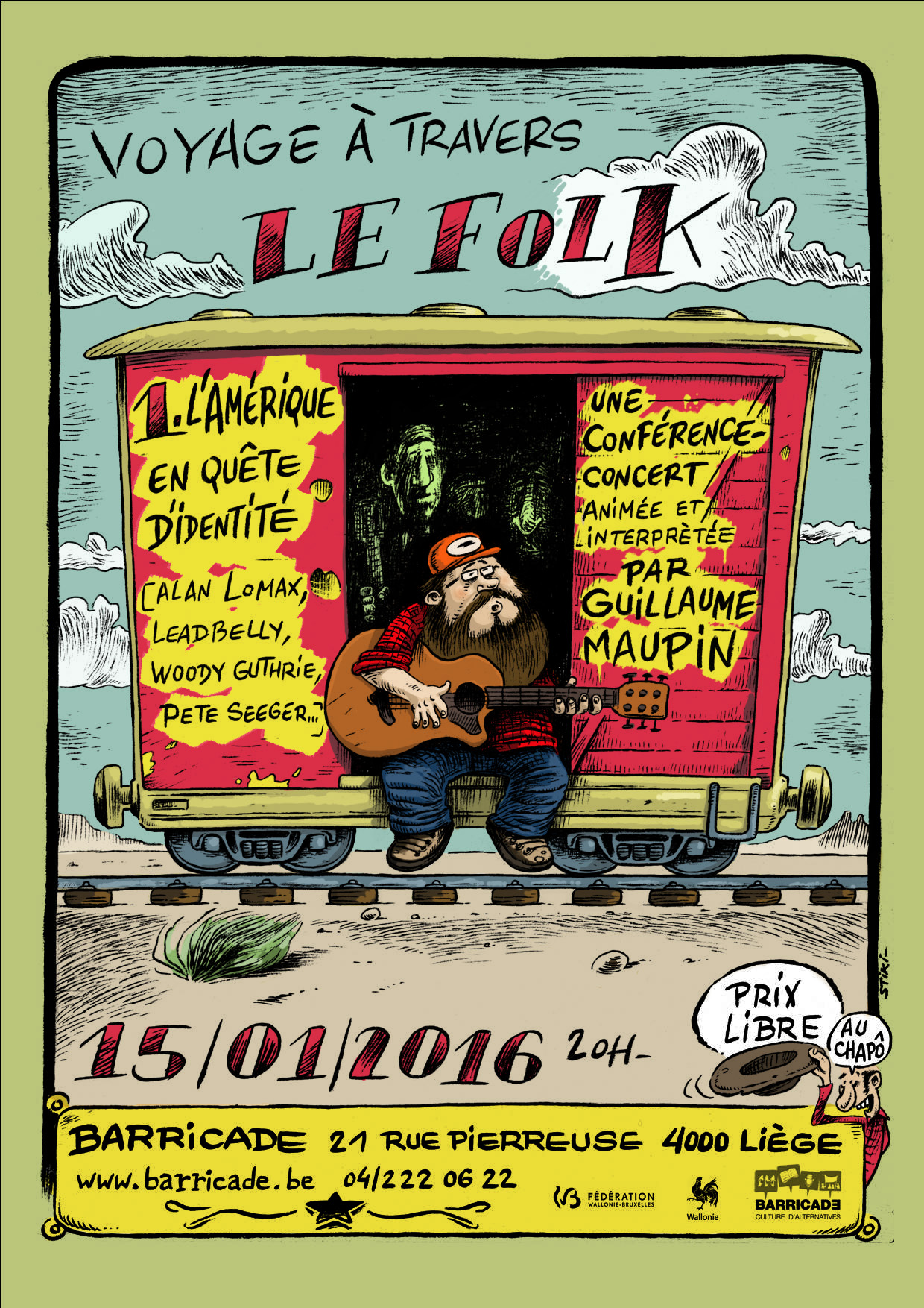 Alan Lomax, Leadbelly, Woody Guthrie, Pete Seeger... ces figures quasi mythiques du folk américain ne brillent pas que pour leur talent artististique. Elles ont aussi porté des espérances, des idées, des colères, des souffrances à l’instar de tant d’autres courants musicaux. Guillaume Maupin nous propose donc de retracer le parcours de quelques-uns de ces folk heroes et d’échanger sur les racines du folk, ses lignes de force, ses problématiques. Le tout illustré par des interprétations en set acoustique de morceaux emblématiques. Car oui, ce sera un échange et un concert. Plaisir des oreilles et étanchement de soif de savoir (et de soif tout court - nous avons un bar).
