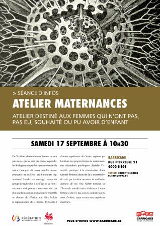 L’atelier est envisagé comme un groupe de recherche, il ne s’agit ni de «militer pour» ni de prôner la non-maternité, pas plus que la maternité, mais d’ouvrir ensemble un chantier de réflexion pour faire évoluer la représentation de la femme. Permettre à d’autres expériences de s’écrire, explorer par l’écriture nos propres formes de maternance, nos «fécondités psychiques» (Isabelle Tilmant), participer à la construction d’une identité féminine dissociée de la maternité et devenir, par la même occasion, de meilleures auteures de nos vies.
