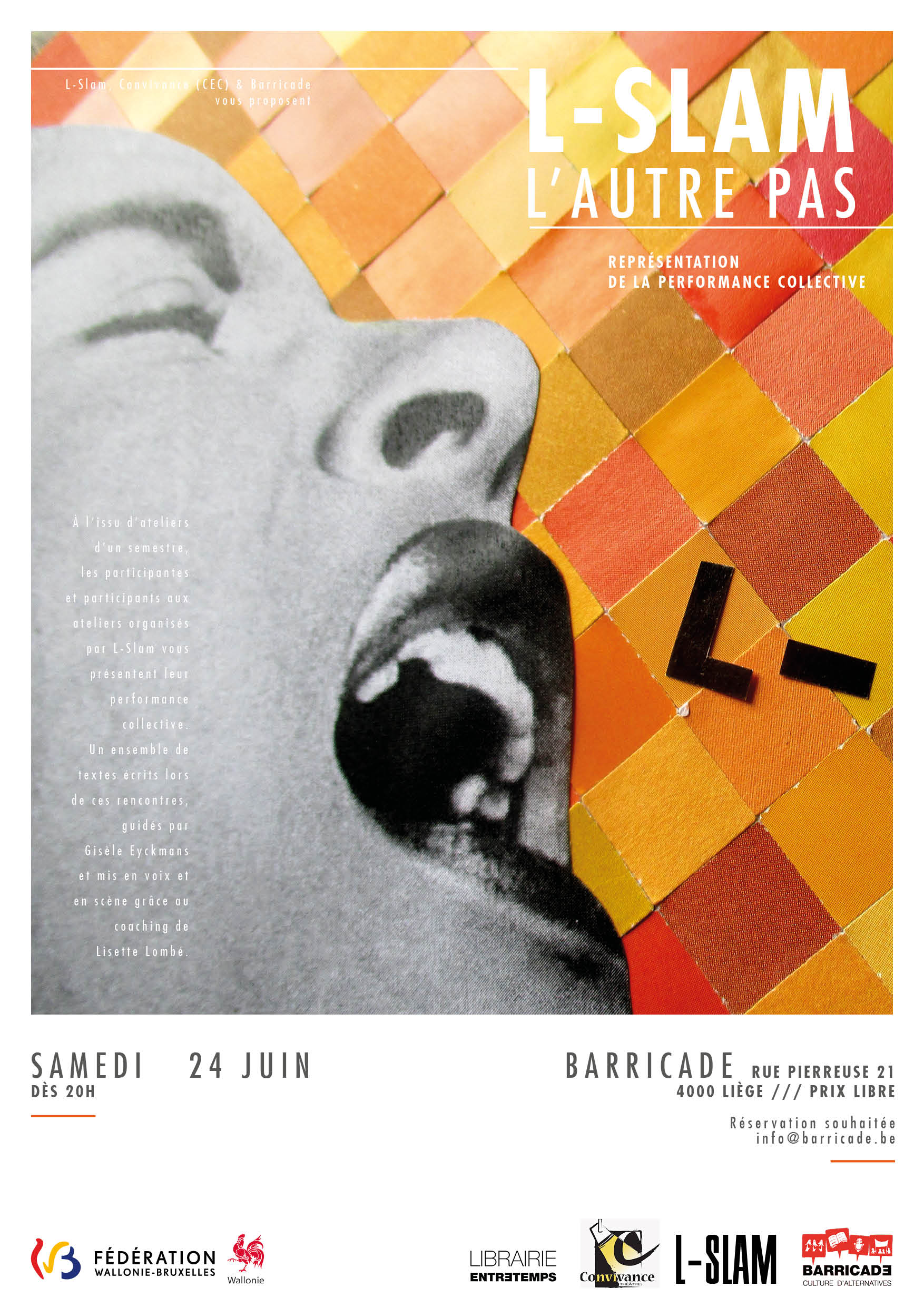 A l’issu d’ateliers d’un semestre, les participantes et participants aux ateliers organisés par L-Slam vous présentent leur performance collective. Un ensemble de textes écrits lors de ces rencontres, guidés par Gisèle Eyckmans et mis en voix et en scène grâce au coaching de Lisette Lombé.