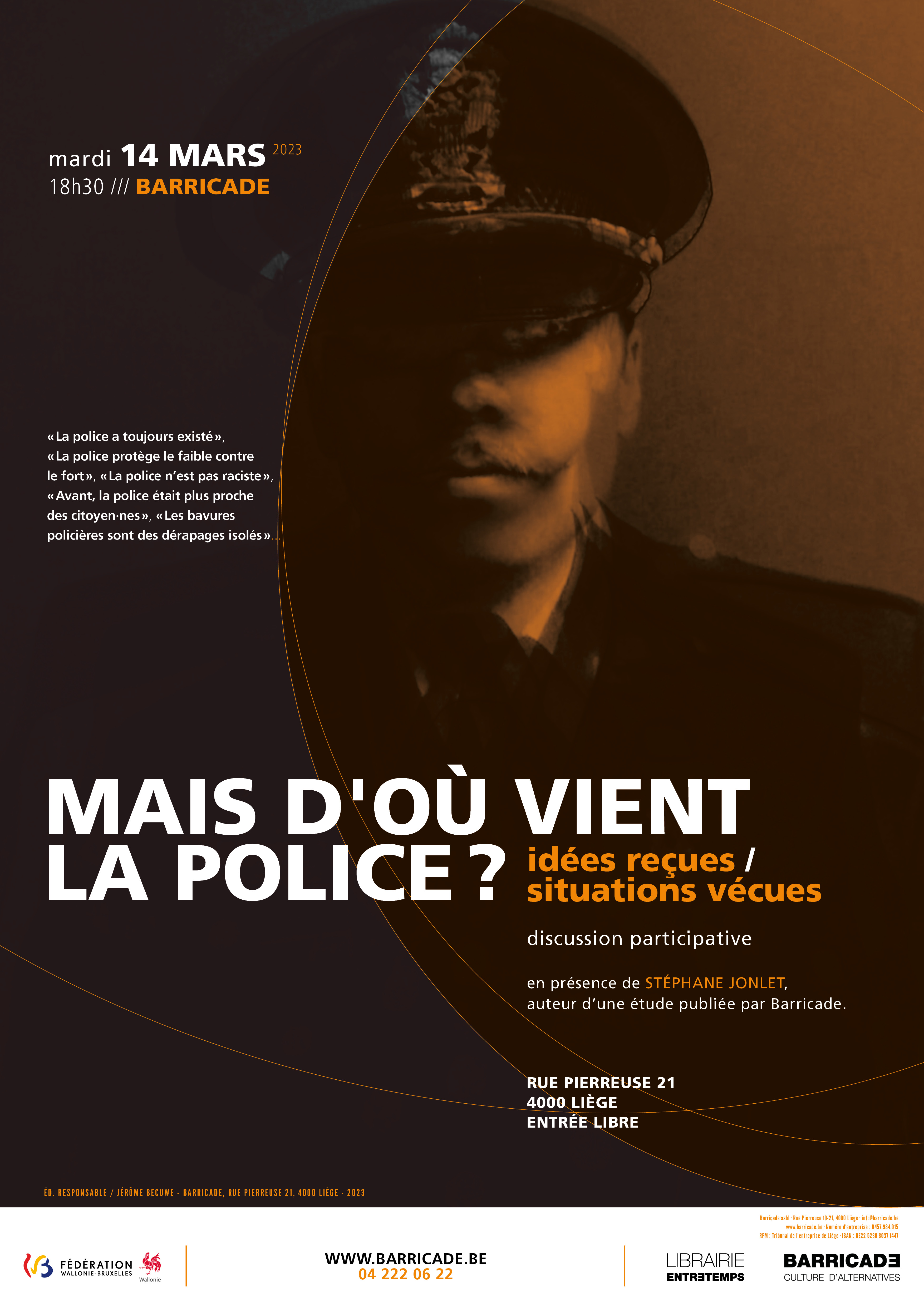 Nos échanges seront complétés par des apports de Stéphane Jonlet, auteur d'une étude publiée par Barricade sur les origines de la police. Une étude riche en enseignements, anecdotes et regards historiques. Pour la découvrir : www.barricade.be/publications/analyses-etudes/mais-ou-vient-police