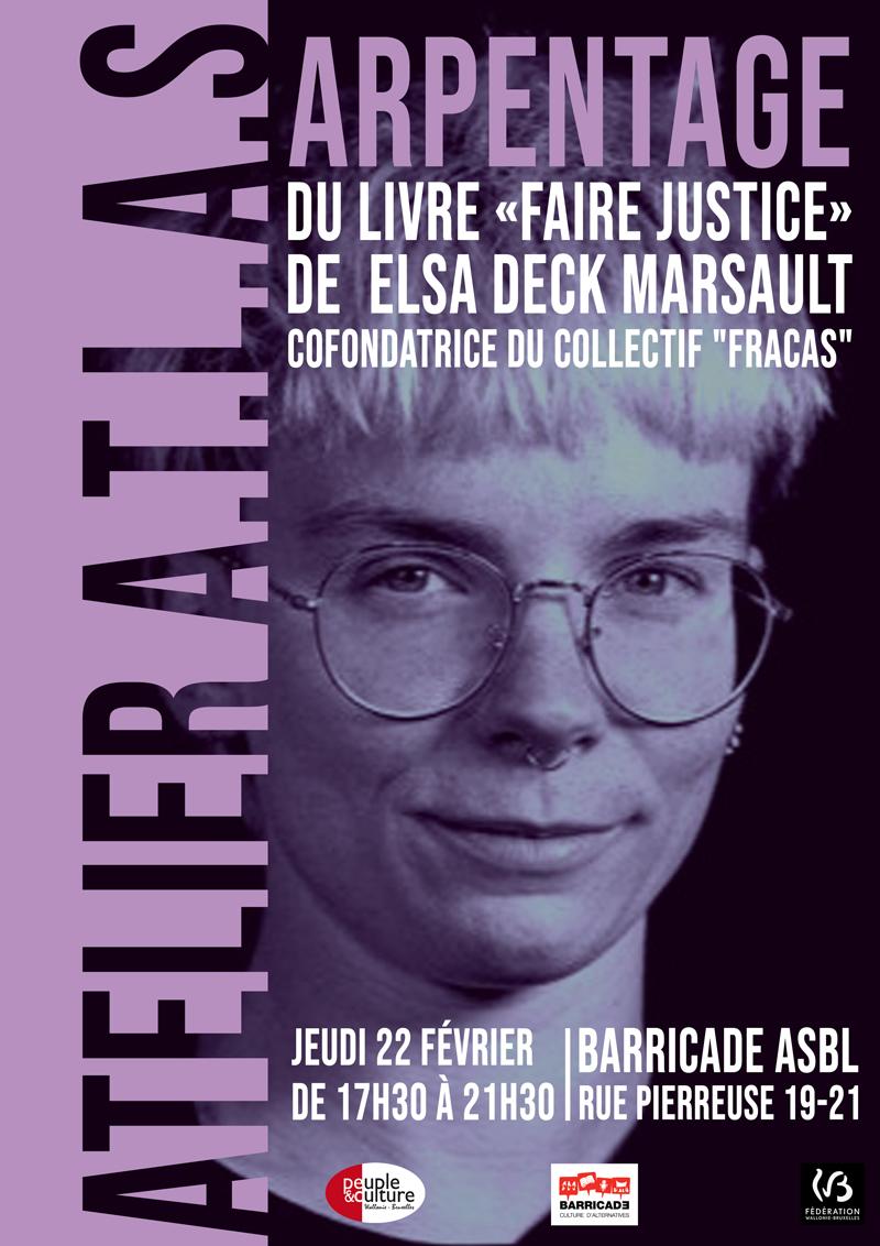 - Le jeudi 22 février à 17h30 dans les locaux de Barricade (rue Pierreuse 19-21), un arpentage* de son livre « Faire Justice – Moralisme progressiste et pratiques punitives dans la lutte contre les violences sexistes.