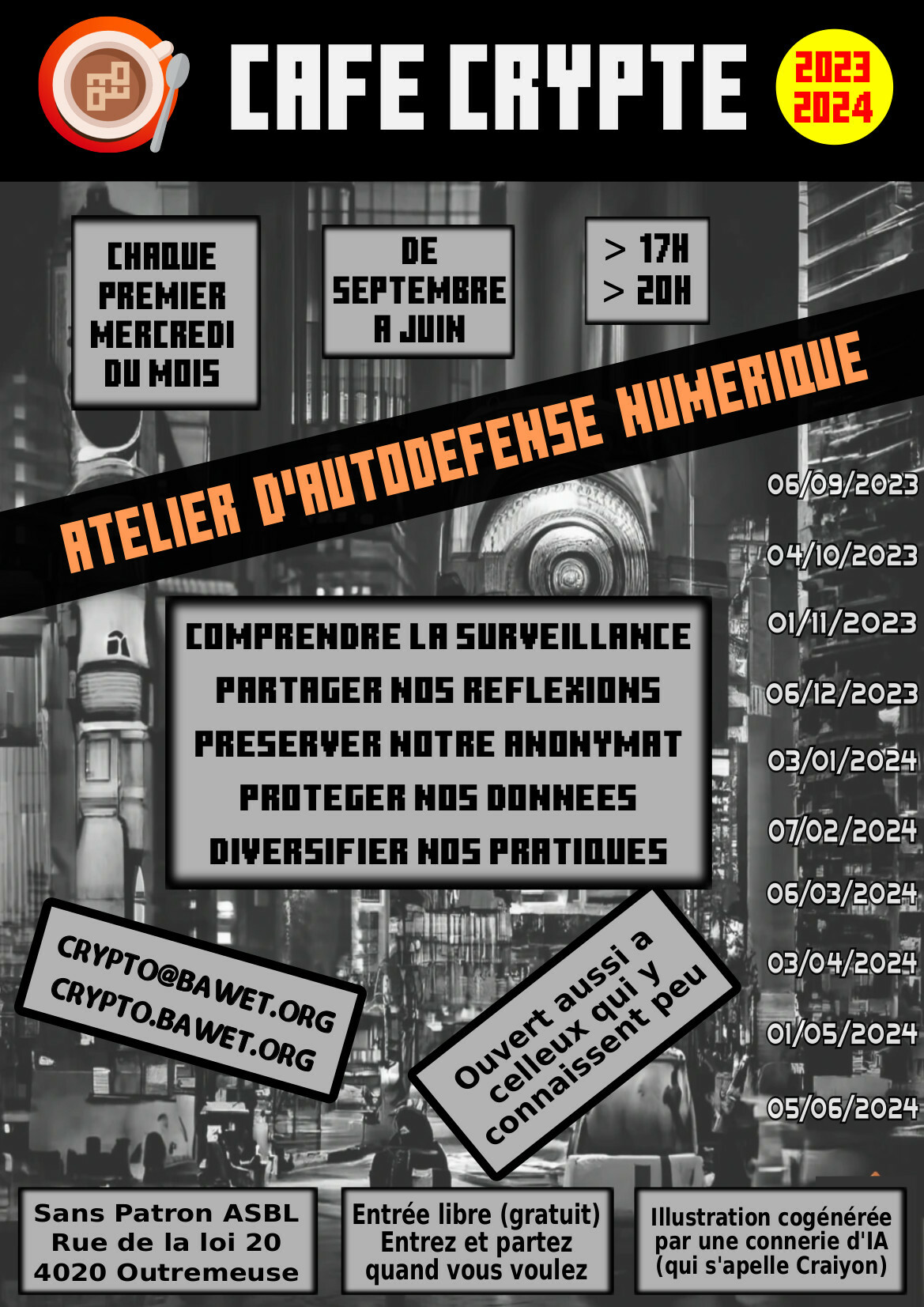 Cette année 2023-2024, les café cryptés se produisent le premier mercredi du mois, de septembre 2023 à juin 2024 entre 17h et 20h à la cantine de la boulangerie Sans Patron, rue de la Loi 20 à 4020 Liege (Outremeuse).