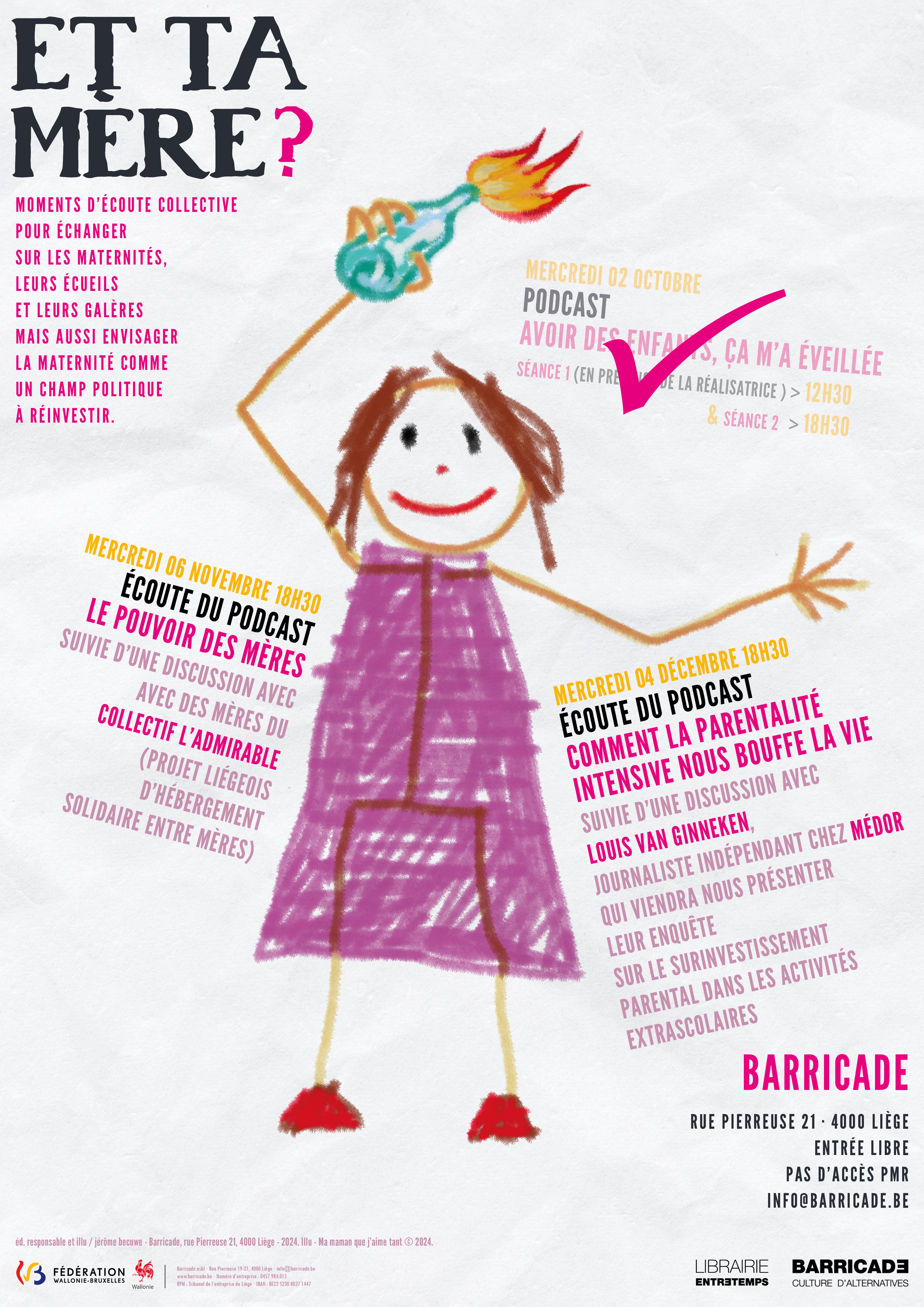 Dans le cadre du cycle "Et ta mère?" Barricade organise l'écoute collective du podcast "Le pouvoir des mères" en présence du collectif "L'admirable" (collectif liégeois d'hébergement solidaire entre mères). L'occasion d'échanger sur la maternité, ses écueils, ses enjeux et sa puissance politique, car être mère est éminemment féministe.