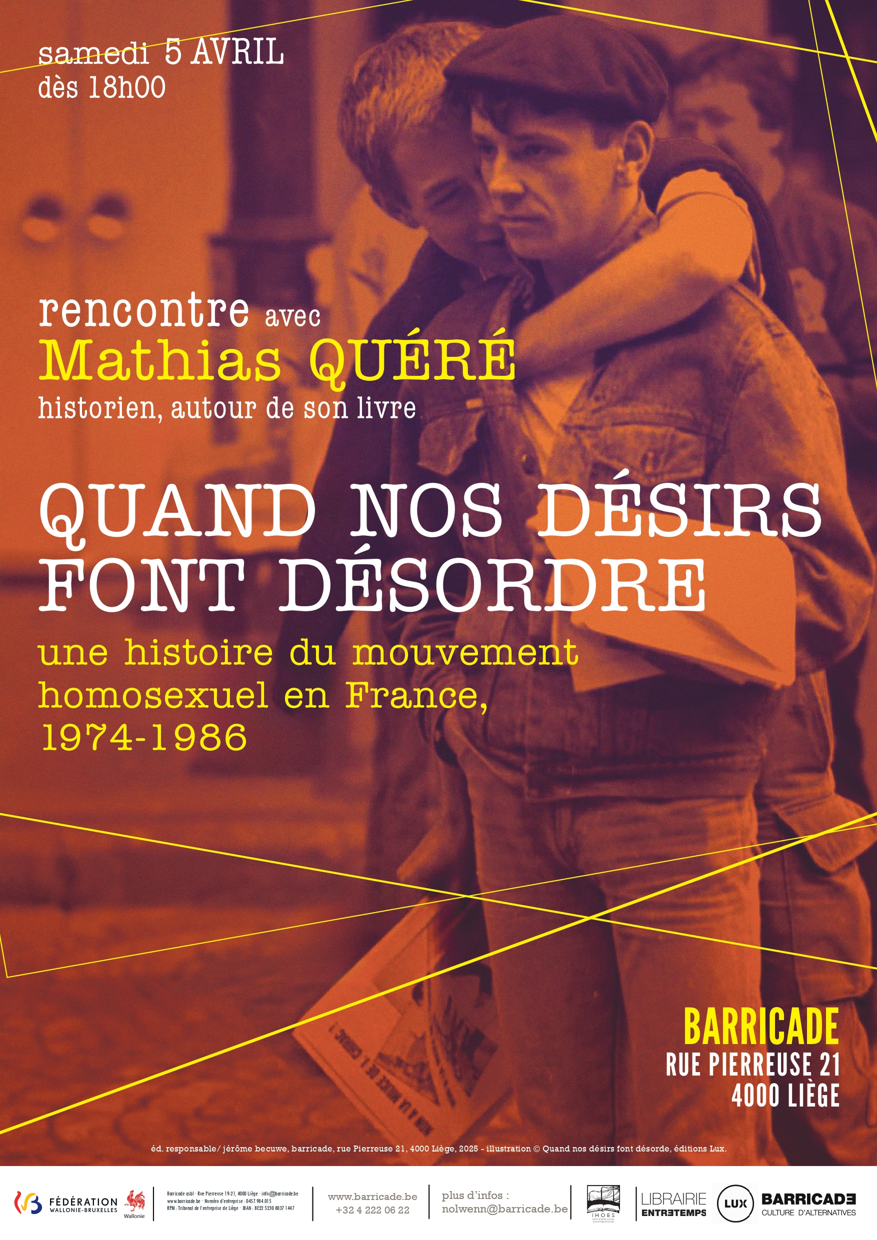 C’est dans ce contexte que les ASBL Barricade et l’Institut d’Histoire Ouvrière, Économique et Sociale (IHOES) vous invitent à une rencontre avec Mathias Quéré autour de son livre « Quand nos désirs font désordre : une histoire du mouvement homosexuel en France, 1974-1986 ».