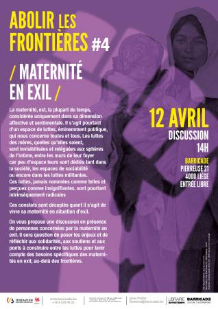 Nous vous proposons une discussion en présence de personnes concernées par la maternité en exil. Il sera question de poser les enjeux et de réfléchir aux solidarités, aux soutiens et aux ponts à construire entre les luttes pour tenir compte des besoins spécifiques des maternités en exil, au-delà des frontières.