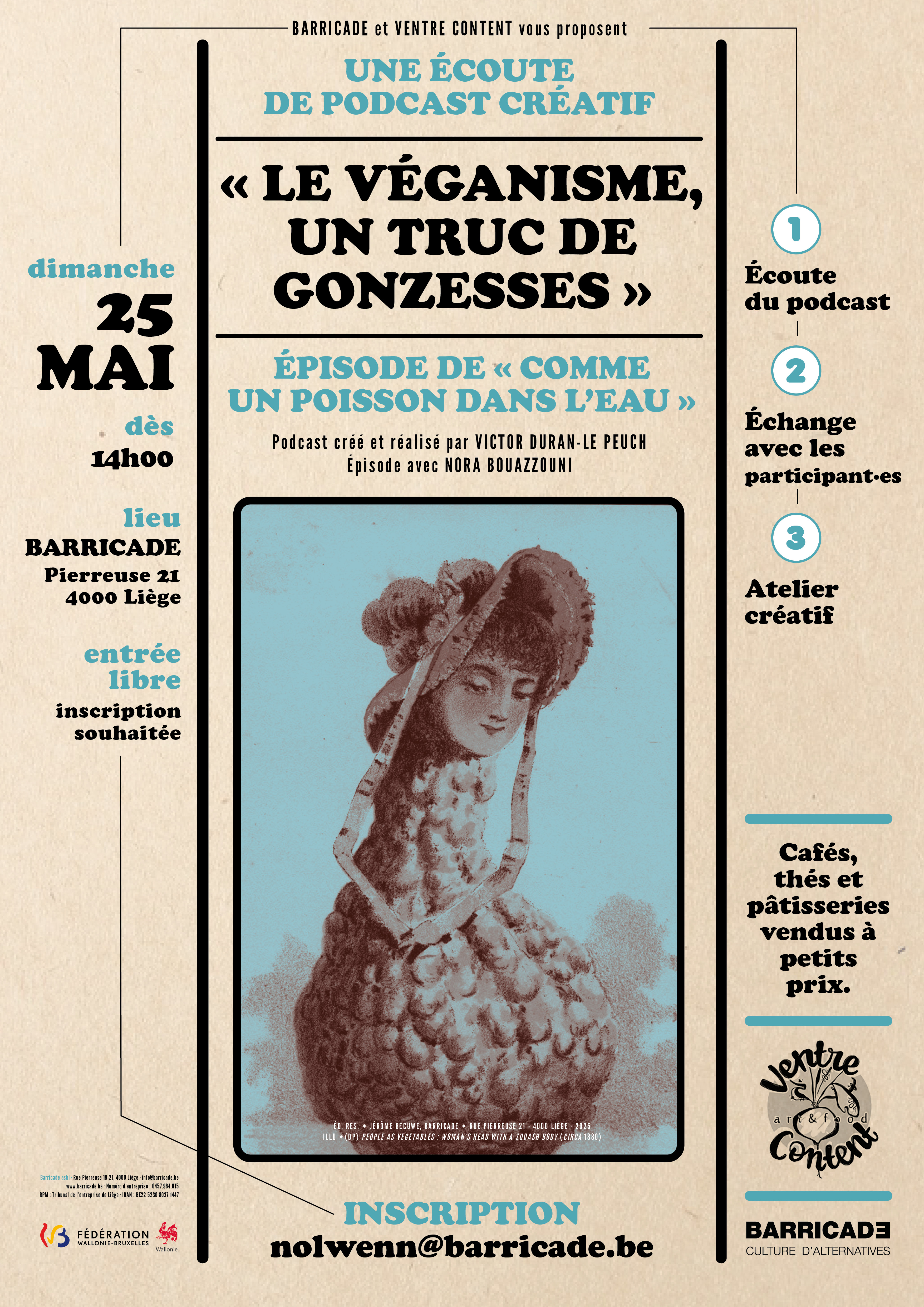 Barricade et Ventre Content vous donnent rendez-vous ce dimanche 25 mai pour une écoute du podcast "comme un poisson dans l'eau" avec l'épisode "Le véganisme, un truc de gonzesses" avec Nora Bouazzouni.