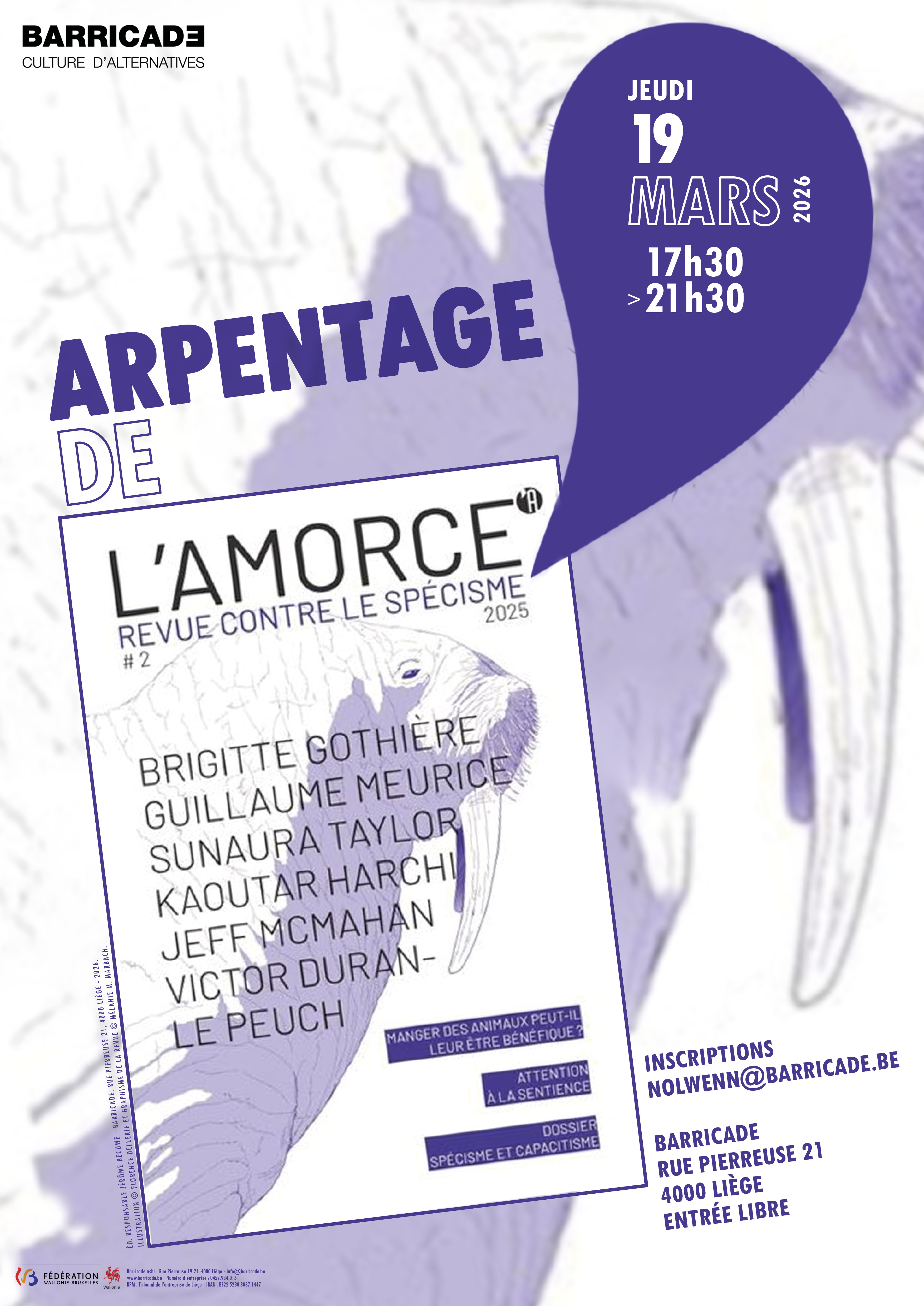 Le 19 mars, de 17h30 à 21h30, Barricade organise un arpentage du second numéro de "L'amorce, la revue contre le spécisme », la principale revue francophone consacrée à l'étude du spécisme: la discrimination selon l'espèce.